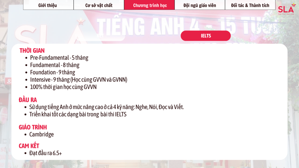 Chương trình IELTS dành cho học viên từ 14 tuổi trở lên, có nhu cầu sử dụng tiếng Anh phục vụ học tập, xét tuyển và định hướng tương lai. Khóa học được thiết kế theo lộ trình cá nhân hóa, tập trung phát triển chuyên sâu 4 kỹ năng Nghe – Nói – Đọc – Viết cùng chiến lược làm bài thi IELTS. Sau khóa học, học viên nắm vững kỹ năng làm bài, nâng cao tư duy học thuật và đạt mục tiêu điểm số IELTS phù hợp với định hướng học tập và nghề nghiệp.